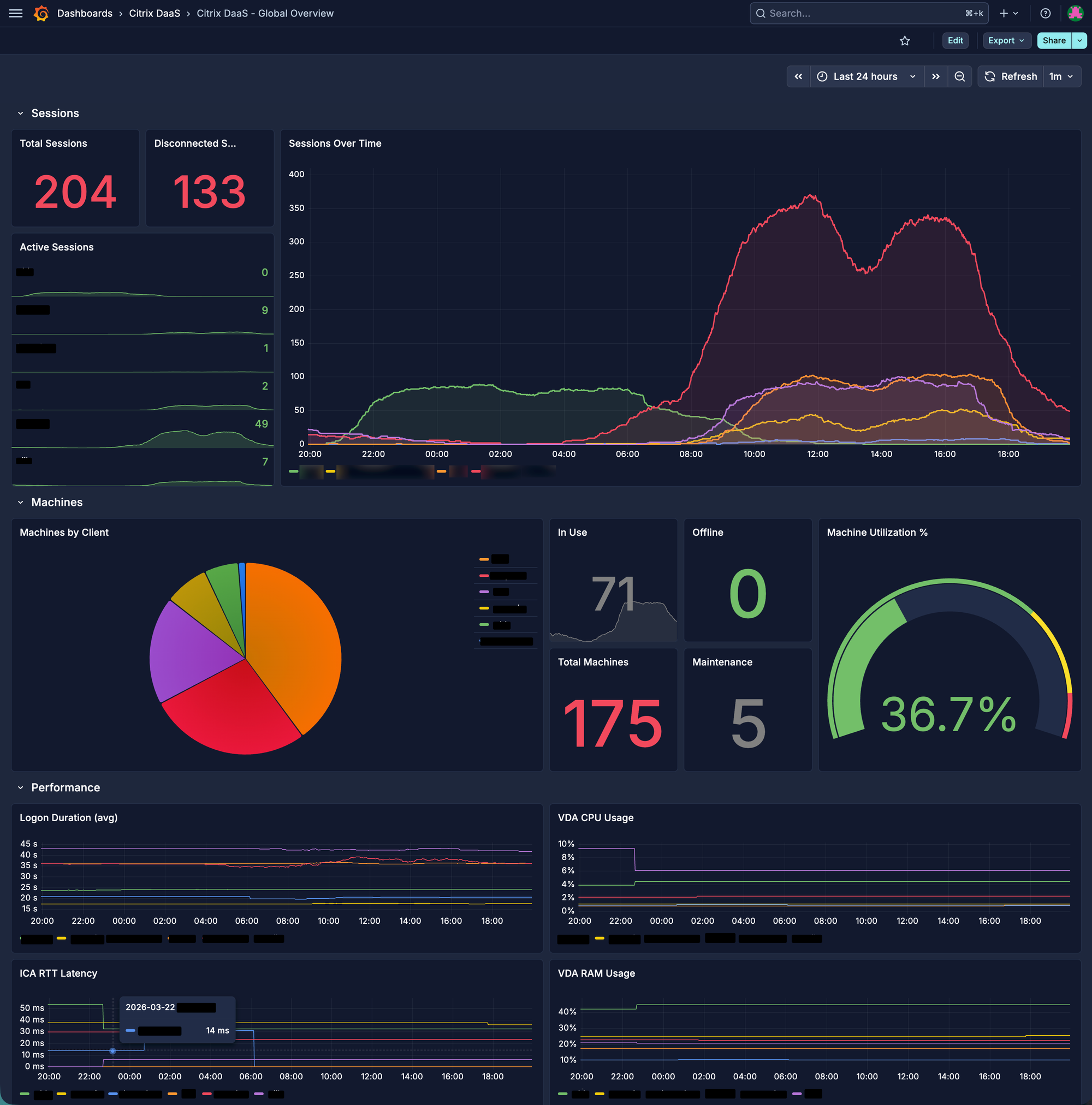 When I first dove into monitoring Citrix DaaS at scale, I quickly learned that the standard go-to - Citrix Monitor / Director - leaves you scrambling for insights. It can't give you the long-term trends, cross-customer correlations, or deep performance analysis you need. The only way to truly own the telemetry is to build it yourself. Below is the full blueprint of the stack I've assembled, running with Python, InfluxDB, and Grafana.