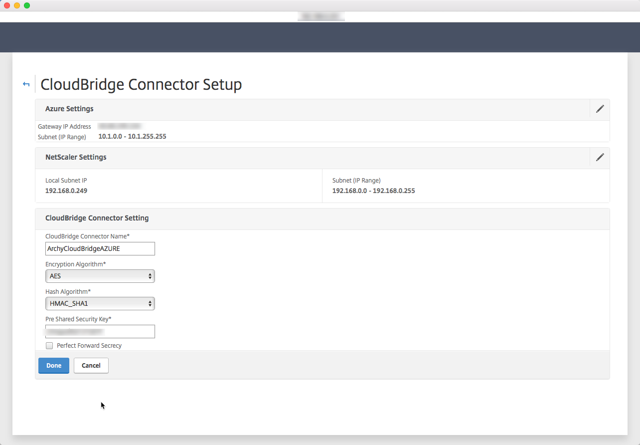 Enter a name for this CloudBridge Connector and the Pre Shared Security Key we used on the Azure VPN connection we created. Click on Done