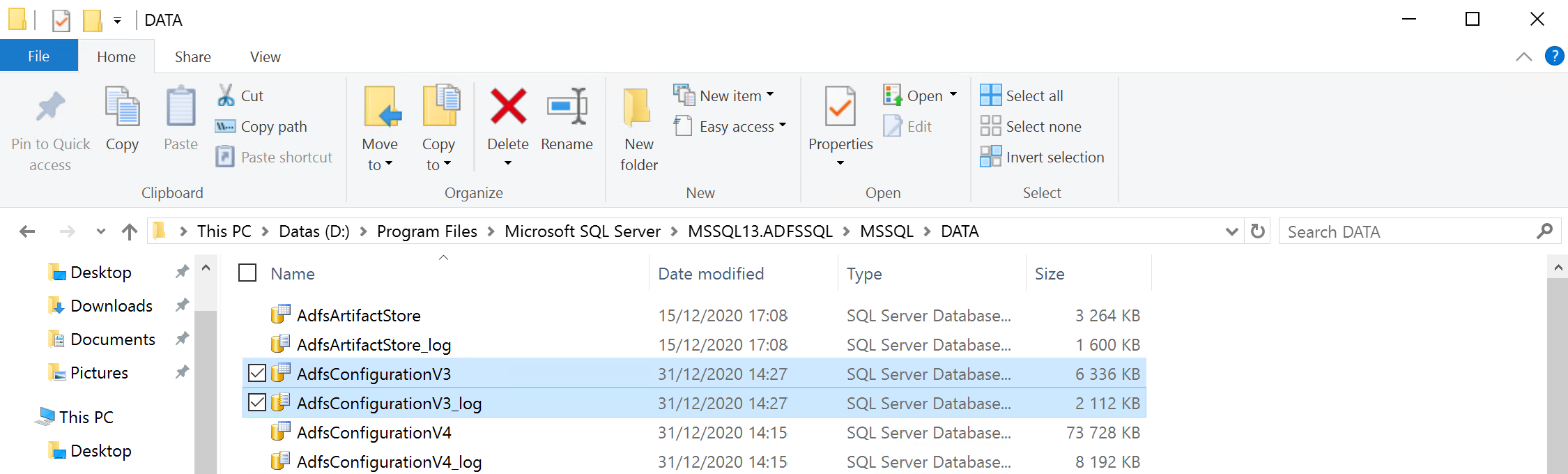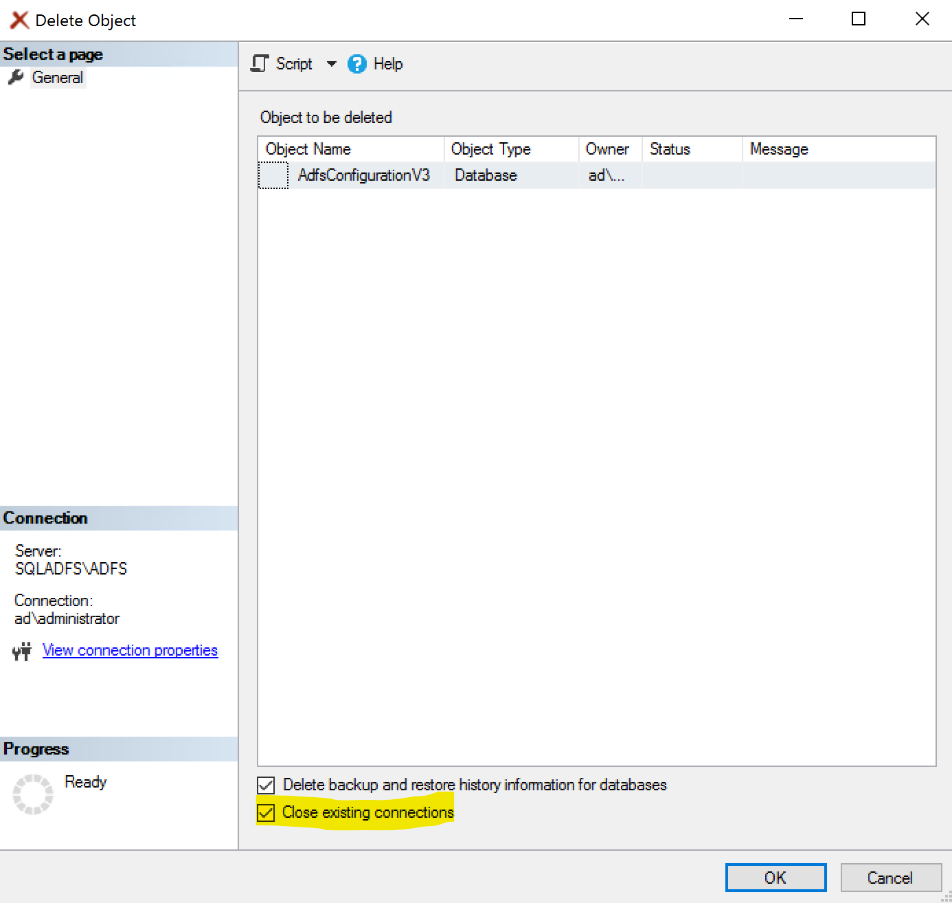 Select the database name “ADFSConfigurationV3”, click right on the database and select “Delete”